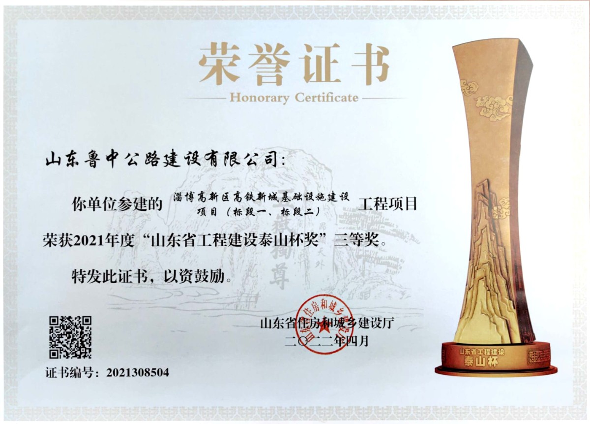 - 淄博高新區(qū)高鐵新城基礎設施建設項目榮獲2021年度”山東省工程建設泰山杯獎“三等獎