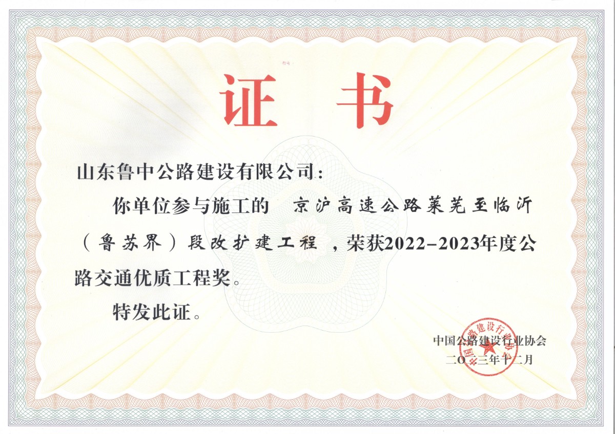 - 京滬高速公路萊蕪至臨沂(魯蘇界)段改擴建工程榮獲2022-2023年度公路交通優(yōu)質工程獎