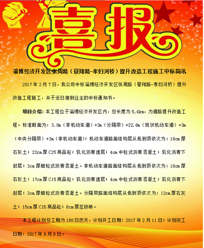 淄博經濟開發(fā)區(qū)張周路(晝翔路-孝婦河橋)提升改造工程施工中標簡訊