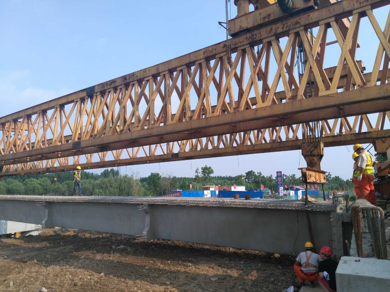 為確保架梁施工安全,項(xiàng)目部精心制定施工方案。同時(shí),在架梁機(jī)械驗(yàn)收合格后多次對(duì)其進(jìn)行檢查,對(duì)作業(yè)人員進(jìn)行班前教育,做好交底,制定應(yīng)急預(yù)案,保證了整個(gè)架梁過(guò)程安全、高效。隨著架梁設(shè)備有節(jié)奏的完成一項(xiàng)項(xiàng)動(dòng)作,襯墊、落勾、試吊、起吊、推進(jìn),在一串協(xié)調(diào)而又連貫的運(yùn)作之后,人民路延伸工程孝婦河橋第一片梁板穩(wěn)穩(wěn)降落在它發(fā)揮作用的位置上。