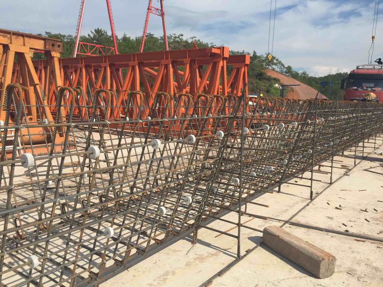 二、使用方法將胎架放置在水平的硬化場(chǎng)地,首先將裁好的腹板外層縱向筋擺放到胎架套筒水平定位筋上,再將加工好的腹板環(huán)形筋和底板環(huán)形筋按刻度一一擺放好并與縱向筋綁扎,然后再穿入底板縱向筋并按刻度綁扎,最后綁扎腹板內(nèi)側(cè)縱向筋。上述工作全部進(jìn)行完畢,經(jīng)監(jiān)管工程師驗(yàn)收后,將胎架兩側(cè)水平定位筋由套筒向外抽出,采用龍門(mén)吊即可將骨架吊裝至箱梁底模,接著進(jìn)行下一道工序。