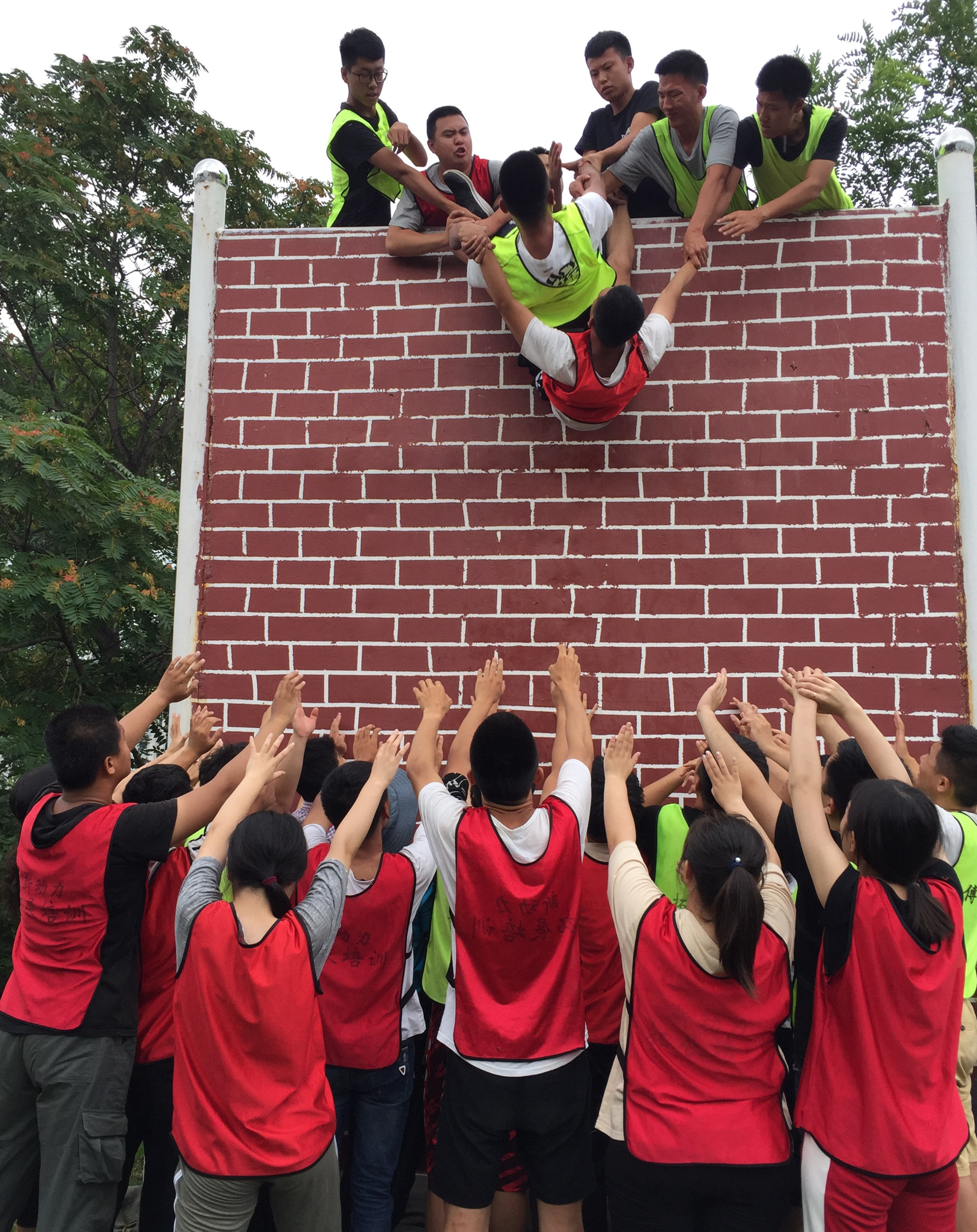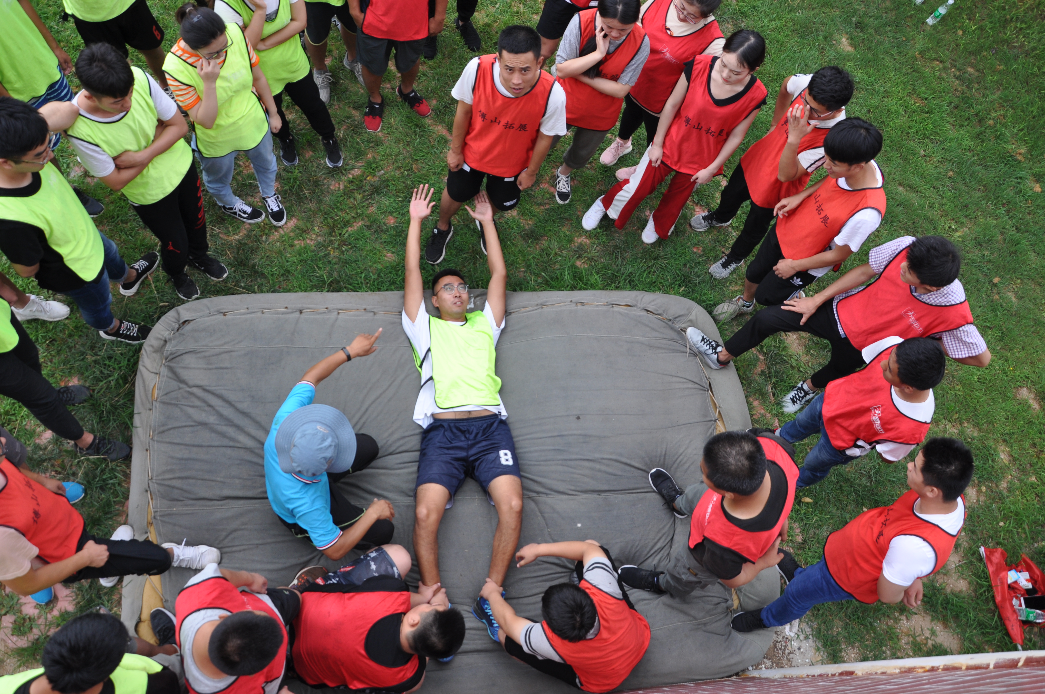 信任背摔項目中,隊友們搭起堅實的人床,保證挑戰(zhàn)隊員的安全