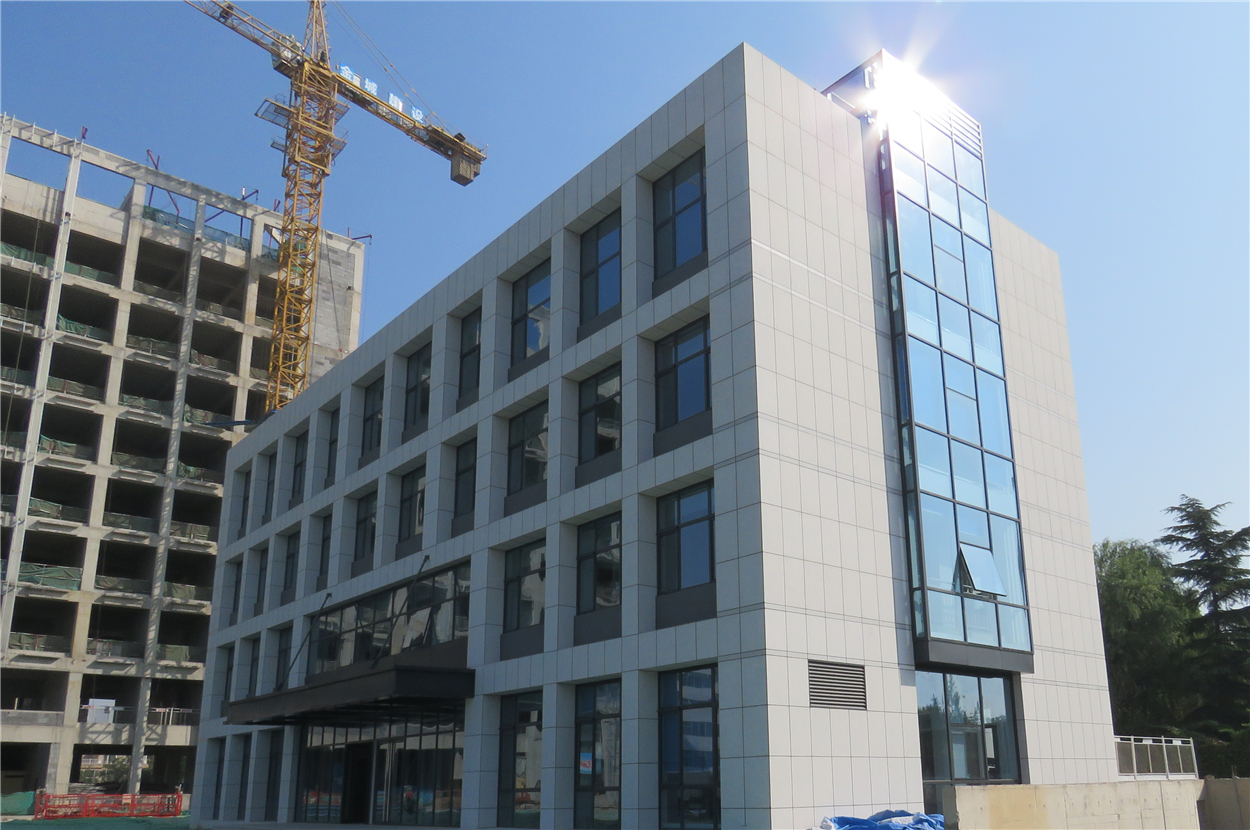 市政檢測樓(2#)外 墻采用萊州白麻荔枝面大理石,玻璃幕墻采用PA隔熱型鋁合金及Low-E中空玻璃。