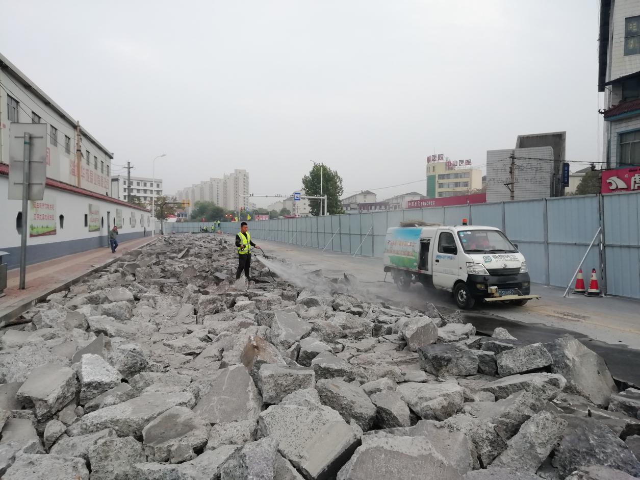 為了能趕在交通早高峰之前完成圍擋和封路,施工隊長張棟皓帶領施工人員凌晨就趕到了施工現(xiàn)場進行施工。此次封路采取的是半幅封路半幅開通的方式,為的也是能把施工對道路暢通的影響降到最低。為防止揚塵,破除混凝土之前以及混凝土塊外運的過程中安排了灑水車。