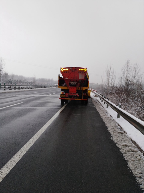 本月初,我部人員在接到養(yǎng)護(hù)中心除雪防滑的通知后,第一時間準(zhǔn)備就緒,除雪車順利上路撒布融雪劑。作業(yè)期間三輛除雪車從各個路段同時噴灑,確保除雪工作不間斷進(jìn)行。并每輛除雪車后安排一輛應(yīng)急保障車輛,保障施工安全和施工質(zhì)量。除正常撒布融雪劑外,我部還安排除雪車將道路內(nèi)側(cè)車道、橋梁、背陰路段積雪進(jìn)行鏟除。歷時施工兩日,除雪應(yīng)急工作已順利完成,道路積雪融化,車輛正常行駛。