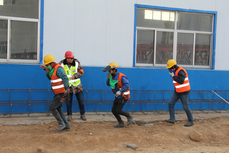 演練當(dāng)天現(xiàn)場(chǎng)氣溫達(dá)到零下9攝氏度,寒風(fēng)肆虐。演習(xí)開始后,伴隨著急促的火災(zāi)警報(bào)聲,演習(xí)現(xiàn)場(chǎng)濃煙滾滾,火借風(fēng)勢(shì)迅速蔓延。面對(duì)危急形勢(shì),項(xiàng)目部立即啟動(dòng)安全應(yīng)急預(yù)案,迅速組織搶險(xiǎn)救援組攜帶滅火器進(jìn)入現(xiàn)場(chǎng)進(jìn)行滅火。為避免火勢(shì)蔓延,通訊聯(lián)絡(luò)組第一時(shí)間與消防部門進(jìn)行聯(lián)系,請(qǐng)求支援,同時(shí),迅速指揮火場(chǎng)人員撤退,演習(xí)人員在現(xiàn)場(chǎng)指揮人員的組織和引導(dǎo)下,手拿濕毛巾捂住口鼻,彎腰快速通過火場(chǎng)到達(dá)安全地帶。警戒保衛(wèi)組同步設(shè)置警戒線,疏散無(wú)關(guān)人員,醫(yī)療救護(hù)組同時(shí)也抵達(dá)現(xiàn)場(chǎng),對(duì)受傷工人進(jìn)行救治。經(jīng)過幾分鐘的撲救,最終火勢(shì)被順利撲滅?;馂?zāi)撲滅后,善后處理組對(duì)火災(zāi)現(xiàn)場(chǎng)做進(jìn)一步排查,尋找、總結(jié)火災(zāi)出現(xiàn)的原因,確保安全隱患徹底排除。