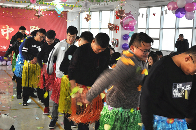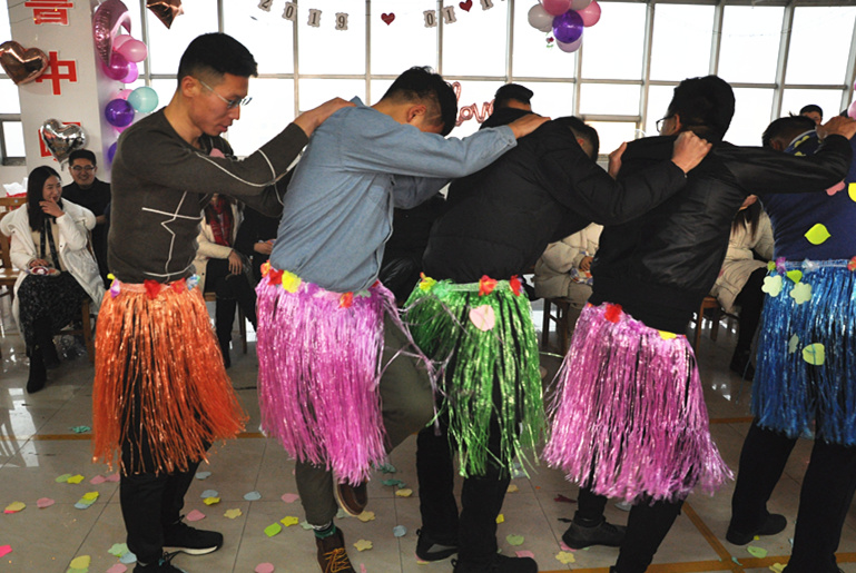一個個游戲下來,聰明能干、呆萌踏實的小伙子們已經(jīng)打動了姑娘們的芳心,但魯中公路小伙子的身上不僅僅只有這些亮點,還有幽默、豁達、鮮活的另一面。隨著主持人的指令,手掌互動的小游戲選出了需要被懲罰的人。小伙子們主動請纓替女生受罰,身著草裙的他們開始“舞動人生”。婀娜的舞姿、妖嬈的步伐引來全場的陣陣笑聲,把整個會場氣氛推向高潮。