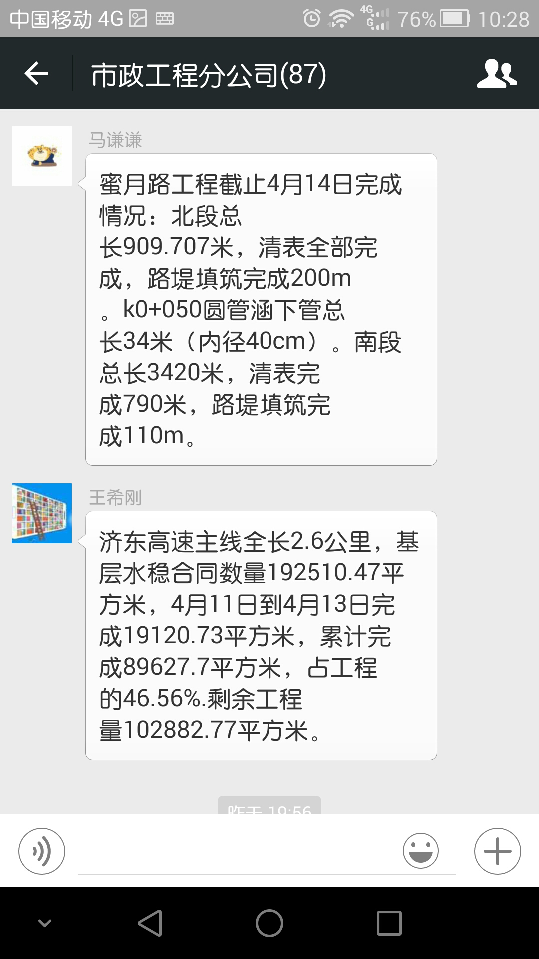 市政工程分公司于近期通過微信這一網(wǎng)絡社交app搭建了我們自己的工程信息實時分享平臺。成立分公司后,在分公司領導授意下,原淄川拌合站微信群擴大為市政工程分公司信息群,隨著各個工地工程的陸續(xù)展開,各種工程信息、進展動態(tài)源源不斷的推送至這一平臺,打開界面,總能看到領導們伸出大拇指的點贊和諸如“注意安全,抓好質(zhì)量”之類的耳提面命,我想這就為奮戰(zhàn)在一線的同仁們送去了一股暖流,也有同事們發(fā)來的施工照片、視頻、技術資料、實時數(shù)據(jù),這都為日后的發(fā)展積累了經(jīng)驗、儲備了技術。另一方面,微信平臺也是我們轉(zhuǎn)變思想、改革宣傳方法的一項舉措,我們主張有工作就要有宣傳,宣傳材料作為工作成果上傳,讓大家了解自身崗位、了解自身光輝。通過這種形式,大大提升了員工參與工作的積極性,工作效率明顯提高。