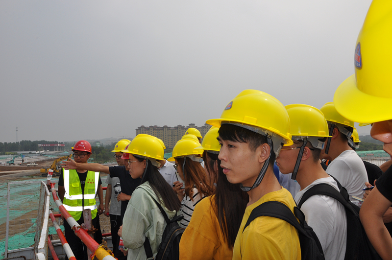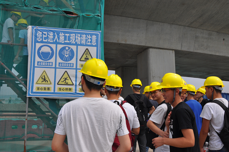 師生們一行首先參觀了雙魯立交橋施工現(xiàn)場,通過C匝道橋俯瞰整個(gè)施工現(xiàn)場,對(duì)工地進(jìn)展情況做了基本了解。然后實(shí)地觀摩了C匝道橋、B集散橋以及主線橋工藝,項(xiàng)目經(jīng)理黎正新向師生們講解了項(xiàng)目的概況和橋梁施工各工序作業(yè)流程及相關(guān)控制要點(diǎn);并從施工標(biāo)準(zhǔn)化和規(guī)范化、管理信息化等方面對(duì)工程的實(shí)施進(jìn)行了講解。項(xiàng)目橋梁現(xiàn)場負(fù)責(zé)人張博森帶領(lǐng)師生團(tuán)參觀了橋梁主體結(jié)構(gòu),對(duì)橋梁施工的現(xiàn)澆箱梁的支架搭設(shè)、模板鋪設(shè)、鋼筋綁扎以及混凝土澆筑進(jìn)行詳細(xì)講解,同時(shí)也對(duì)雙魯立交橋從下部結(jié)構(gòu)樁基施工到現(xiàn)澆箱梁的整個(gè)施工工序進(jìn)行了重要講解,并對(duì)各位師生的疑問一一作了詳細(xì)解答。