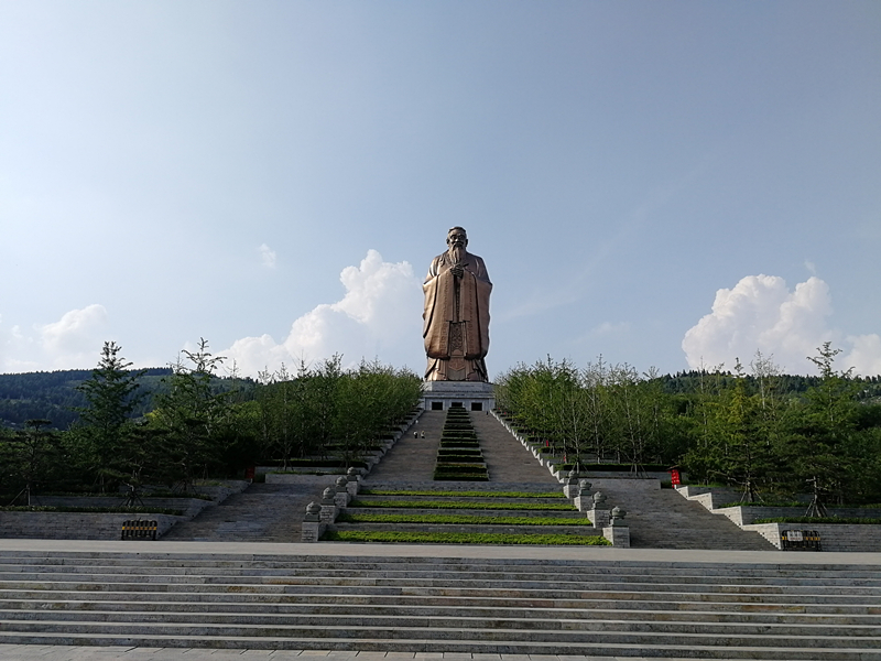 游覽完孔子博物館后,大家午餐并略作修整后,便趕往此次活動(dòng)的第二站——孔子誕生地,也是2018年央視中秋節(jié)晚會(huì)分會(huì)場(chǎng)——尼山圣境。剛到景區(qū),首先映入眼簾的便是遠(yuǎn)端山上屹立的高達(dá)72米的孔子像。據(jù)工作人員介紹,該雕像由著名雕塑家吳顯林先生主持設(shè)計(jì),以唐代畫家吳道子《先師孔子行教圖》為參考,按照“可親、可敬”、“師者、長(zhǎng)者、智者”的形象定位進(jìn)行塑造。雕像位于尼山圣境正中央,加上藍(lán)天白云交相渾映,分外壯觀。