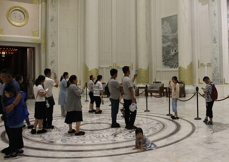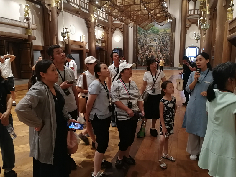 由于午后溫度的持續(xù)升高,為了避免高溫給孩子們帶來的傷害,親子團(tuán)一行首先來到了位于山腰的大學(xué)堂內(nèi)部進(jìn)行游覽,這座氣勢(shì)宏偉,頗具規(guī)模的仿古建筑總面積達(dá)到7萬平方米,包含迎賓大廳、臺(tái)階大廳、七十二賢廊、禮廳、義廳、仁廳、智廳、信廳、禮樂堂等有序的、儀式化的文化空間,匯集中華傳統(tǒng)文化之大成、中華傳統(tǒng)藝術(shù)之大觀、中華民族當(dāng)代文化成就之大器,構(gòu)成集博物、典禮、講堂、會(huì)議、演藝以及其他配套功能等于一體的綜合性文化旅游建筑??匆豢锤畸愄没实慕ㄖ犚宦犗荣t達(dá)人的軼事,再配上講解人精彩細(xì)致的講解,讓人不由的對(duì)中國(guó)古文化生出深深地折服。大人、小孩都一個(gè)個(gè)興奮的拿起毛筆,揮毫潑墨,書寫一篇論語,陶冶一下情操。