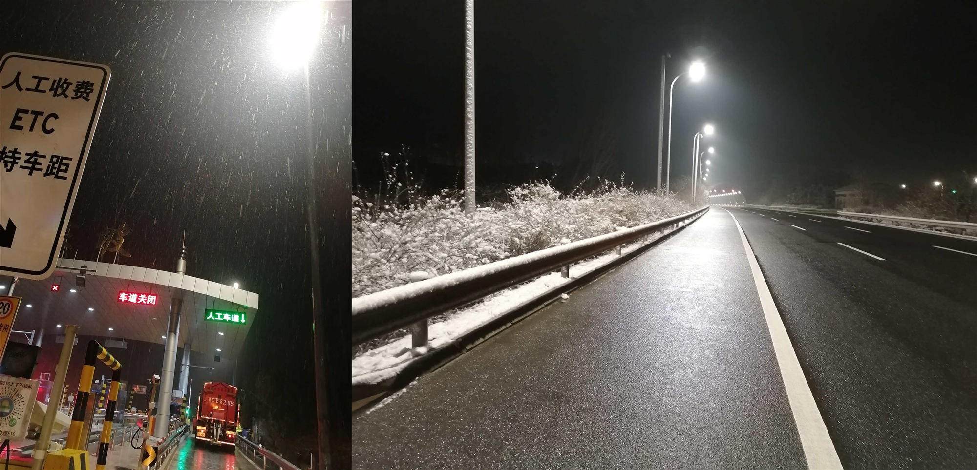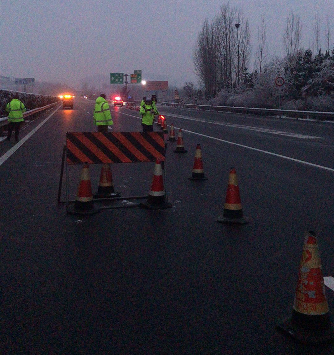 當(dāng)晚21時(shí)天空中開(kāi)始飄起了雪花,21:15時(shí)分別在張家坡收費(fèi)站和魯村收費(fèi)站的跟車(chē)員黃衍剛、陳仁明接到命令開(kāi)始按原定計(jì)劃撒布融雪劑。23:30分,各自路段融雪劑撒布完成。26日5:50,根據(jù)通知要求,以橋面為主繼續(xù)撒布融雪劑,并擺放安全錐配合高速交警疏導(dǎo)、分流過(guò)往車(chē)輛。