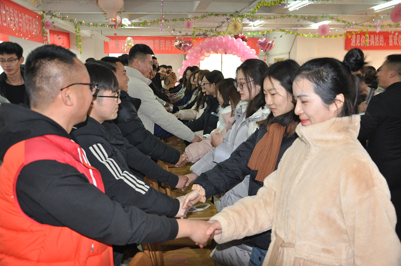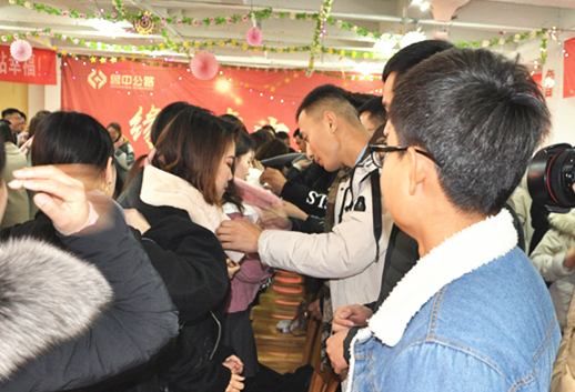 下午13:00過(guò)后,小姑娘們陸續(xù)到場(chǎng),小伙子們有忙著在寒風(fēng)中殷勤迎賓的,有在會(huì)場(chǎng)給姑娘們拍照留念的,有忙活著端茶遞糖的,還有幾個(gè)看傻了眼的,說(shuō)話聲、歡笑聲不絕于耳,整個(gè)會(huì)場(chǎng)瞬間燃了起來(lái)。13:30分,活動(dòng)準(zhǔn)點(diǎn)開(kāi)始,西南分公司的王琨發(fā)來(lái)書(shū)信分享了他通過(guò)聯(lián)誼會(huì)締結(jié)良緣的喜悅,工程管理部李乾親自到現(xiàn)場(chǎng)傳授收獲愛(ài)情的經(jīng)驗(yàn),氣氛也隨著他們的分享逐漸親切起來(lái),順延著這份美好的祝福,男孩子們?yōu)樵趫?chǎng)的所有女生圍上了他們準(zhǔn)備的毛絨圍脖,系住這份溫暖,記住這份緣份。