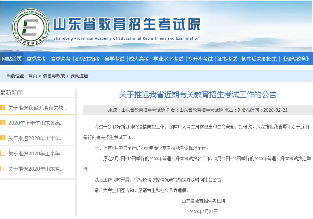 山東專升本考試、春季高考技能考試推遲舉行!