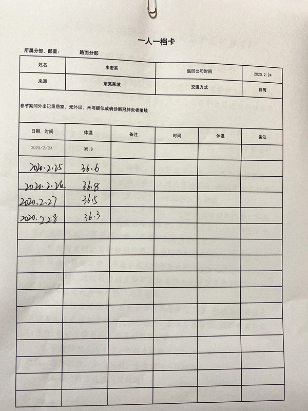 實(shí)行進(jìn)場人員“一人一檔”制度,體溫動態(tài)管理