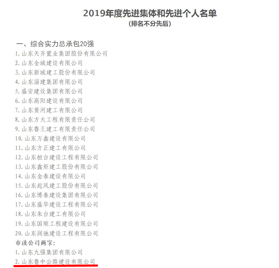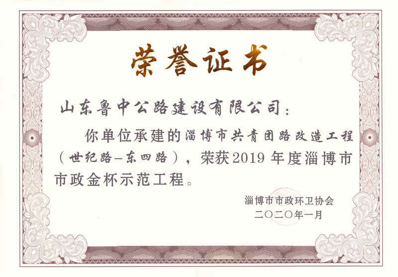 山東魯中公路建設(shè)有限公司被淄博市建筑業(yè)協(xié)會評為“綜合實力總承包20強”企業(yè);被淄博市市政環(huán)衛(wèi)協(xié)會評為“2019年度市政工程質(zhì)量管理先進(jìn)企業(yè)”、“2019年度優(yōu)秀市政施工企業(yè)”。