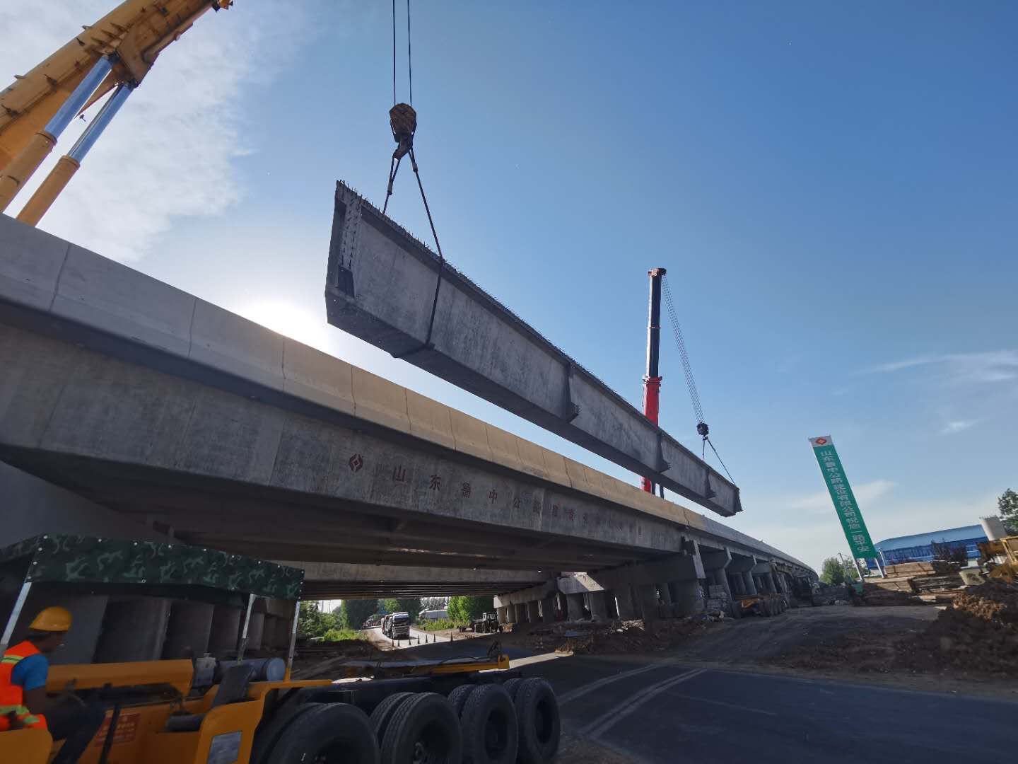 京滬高速公路萊蕪至臨沂段改擴(kuò)建工程第十標(biāo)段,由齊魯交通發(fā)展集團(tuán)投資,山東魯中公路建設(shè)有限公司承建,起訖點(diǎn)樁號(hào)K692+900-K710+000,路線全長17.1km(含紅花埠互通一處、主線收費(fèi)站一處),設(shè)計(jì)速度120km/h,按雙向八車道標(biāo)準(zhǔn)進(jìn)行擴(kuò)建。我部于2020年1月18日率先完成第四階段全幅交通導(dǎo)改,右幅雙向通行,左幅封閉施工,進(jìn)行左幅老橋拆除新建和路面施工。其中K693+964.355歸昌特大橋,全長共1233m,共14聯(lián),是我標(biāo)全線唯一的特大橋,也是全線重點(diǎn)控制工程之一,歸昌特大橋1-3聯(lián)上部結(jié)構(gòu)形式采用現(xiàn)澆普通鋼筋砼空心板、第10、12聯(lián)采用普通鋼筋砼現(xiàn)澆板(拆除新建)、第4-9、13、14聯(lián)采用預(yù)應(yīng)力砼(先張)橋面連續(xù)空心板(20m共435片,22.31m共5片)、第11聯(lián)采用預(yù)應(yīng)力砼(后張)簡支小箱梁(40m共14片),下部結(jié)構(gòu)采用柱式墩+肋板臺(tái)。預(yù)制箱梁所處位為歸昌特大橋第11聯(lián)拆除新建,上跨G310國道,車流量較大,施工吊裝難度風(fēng)險(xiǎn)大,為確保歸昌特大橋左幅最后5片預(yù)制箱梁順利架設(shè),我部首先進(jìn)行優(yōu)化施工方案、細(xì)化工作計(jì)劃、強(qiáng)化施工組織,成立專門的領(lǐng)導(dǎo)小組,合理進(jìn)行資源配置,然后施工前對現(xiàn)場施工人員進(jìn)行安全、質(zhì)量技術(shù)交底,讓現(xiàn)場每位施工人員能夠熟悉架梁流程及施工安全注意事項(xiàng),提高安全生產(chǎn)意識(shí),嚴(yán)格按照技術(shù)規(guī)范及要求精細(xì)架設(shè)。5月10日我部開始進(jìn)行箱梁吊裝前一系列準(zhǔn)備工作,本次吊裝采用2輛400t汽車吊雙機(jī)起吊的形式進(jìn)行施工,在箱梁運(yùn)輸和架設(shè)過程中,項(xiàng)目部領(lǐng)導(dǎo)親自在現(xiàn)場指揮,我部克服了天氣及運(yùn)梁線路條件復(fù)雜、上跨G310國道等不利因素,在全體人員的共同努力下,于5月11日晚20:10分將左幅最后5片預(yù)制箱梁全部順利吊裝到位,實(shí)現(xiàn)主線全線貫通。