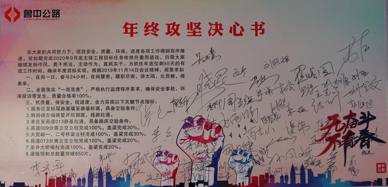2019年11月15日,青蘭項(xiàng)目部全體人員拿出破釜沉舟的決心和越是艱險(xiǎn)越向前的勇氣在《年終攻堅(jiān)決心書》上莊嚴(yán)宣誓,提出“大干五十五,誓奪三億五”的攻堅(jiān)目標(biāo),圓滿且超額完成2019年年度施工計(jì)劃,大幅度領(lǐng)先同線其他6個(gè)標(biāo)段,極大的鼓舞了項(xiàng)目部職工的戰(zhàn)斗熱情和士氣。
