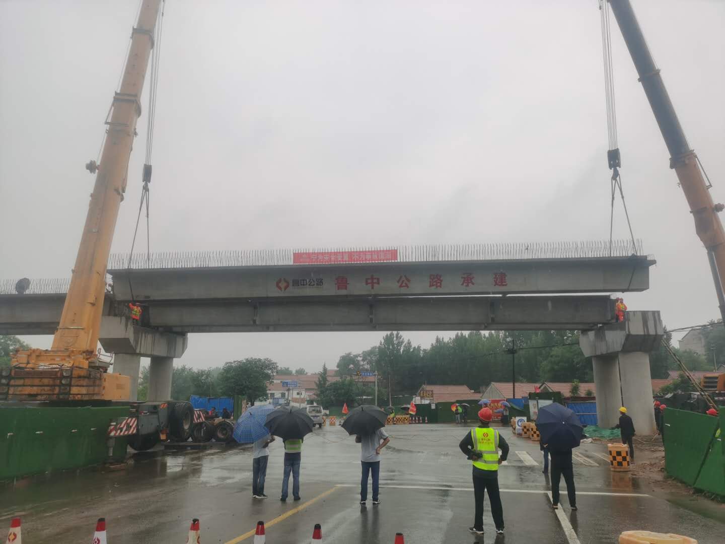 6月17日我部對(duì)膠海線南崔路立交橋第三、四跨箱梁進(jìn)行了吊裝??紤]到本次吊裝的特殊性,我部在6月12日組織召開(kāi)施工及交通組織方案專家論證會(huì),淄博市交通運(yùn)輸事業(yè)服務(wù)中心、沂源縣交通運(yùn)輸局、沂源公路事業(yè)服務(wù)中心、淄博市交通警察支隊(duì)沂源大隊(duì)、監(jiān)理等單位參加了會(huì)議。會(huì)議上確定了吊裝第四跨時(shí)南崔路的封閉方式及繞行提示,并確定了吊裝完成后的防墜物措施。我部自6月14日開(kāi)始通過(guò)掌上麻城、沂源廣播、發(fā)放交通臨時(shí)封閉通知等方法提示車(chē)輛封閉交通時(shí)間。