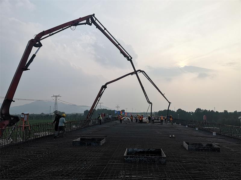 2020年7月5日16時(shí)50分,新寧項(xiàng)目部各施工保障小組準(zhǔn)備完畢,整裝待發(fā),現(xiàn)場(chǎng)2輛混凝土泵車(chē)全部現(xiàn)場(chǎng)待命,隨著首車(chē)混凝土到達(dá)現(xiàn)場(chǎng),K 59+088.719興隆莊特大橋第10聯(lián)右幅第1、2孔現(xiàn)澆箱梁正式開(kāi)始澆筑混凝土。