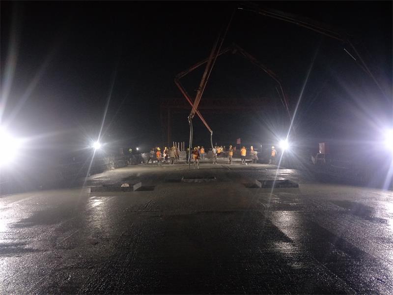 現(xiàn)場(chǎng)管理人員、技術(shù)人員和試驗(yàn)人員全過(guò)程跟蹤作業(yè),經(jīng)過(guò)將近9小時(shí)的緊張奮戰(zhàn),順利完成了K 59+088.719興隆莊特大橋右幅第1、2孔的支架現(xiàn)澆箱梁底腹板混凝土澆筑。本次現(xiàn)澆箱梁順利完成澆筑標(biāo)志著興隆莊特大橋現(xiàn)澆箱梁進(jìn)入了關(guān)鍵性階段,為下一階段的砼澆筑奠定了堅(jiān)實(shí)基礎(chǔ)。