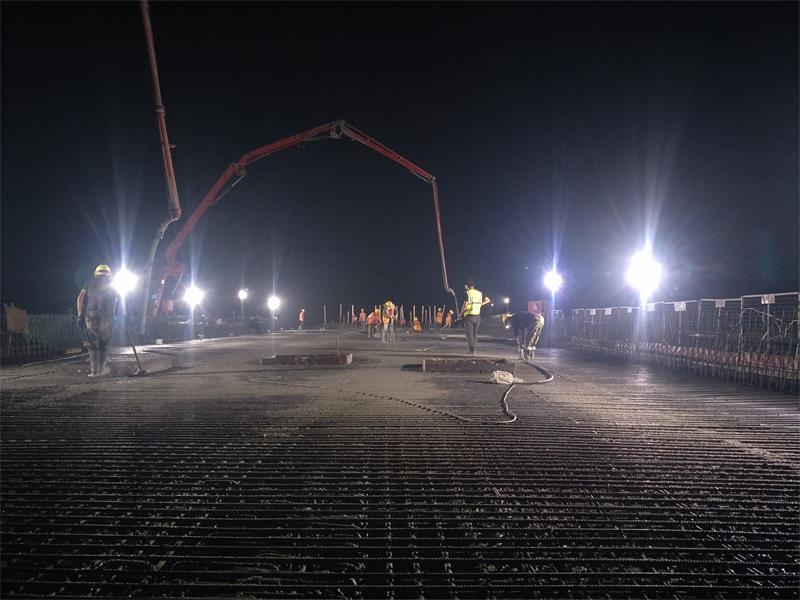 隨著一聲令下,一輛泵車的傳送筒伸向現(xiàn)澆梁作業(yè)地,一輛罐車徐徐倒入指定位置處,燈火通明的夜晚頓時(shí)忙碌起來,為安全高效完成現(xiàn)澆箱梁節(jié)點(diǎn)任務(wù),項(xiàng)目部多次組織現(xiàn)澆梁施工論討會(huì),強(qiáng)化對現(xiàn)場的技術(shù)指導(dǎo),班子成員靠前指揮,嚴(yán)格執(zhí)行領(lǐng)導(dǎo)帶班制度,對施工過程中現(xiàn)場安全防護(hù)、質(zhì)量技術(shù)要求、混凝土供應(yīng)保障等作出了周密部署。從25日19:55,經(jīng)過8個(gè)小時(shí)的連續(xù)作業(yè),于7月26日3:55順利完成澆筑。