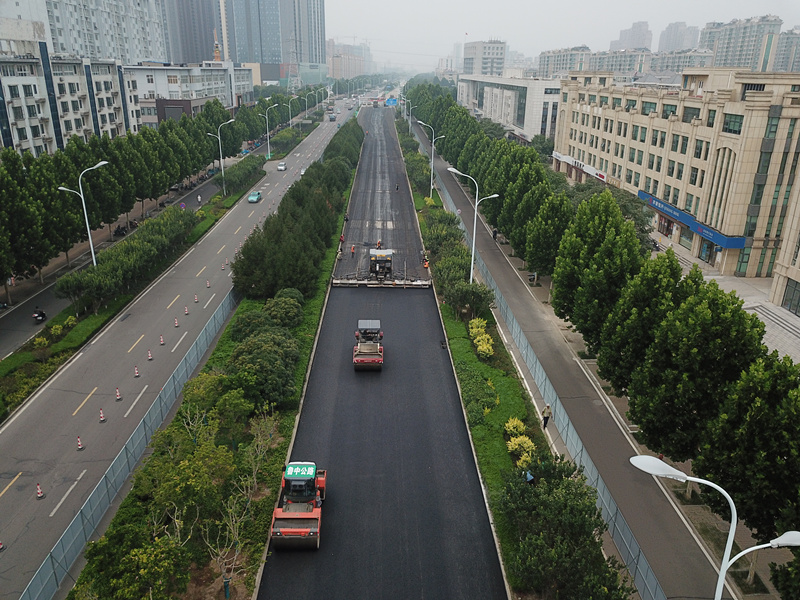 聯(lián)通路北側(cè)機(jī)動(dòng)車道瀝青攤鋪施工現(xiàn)場(chǎng)