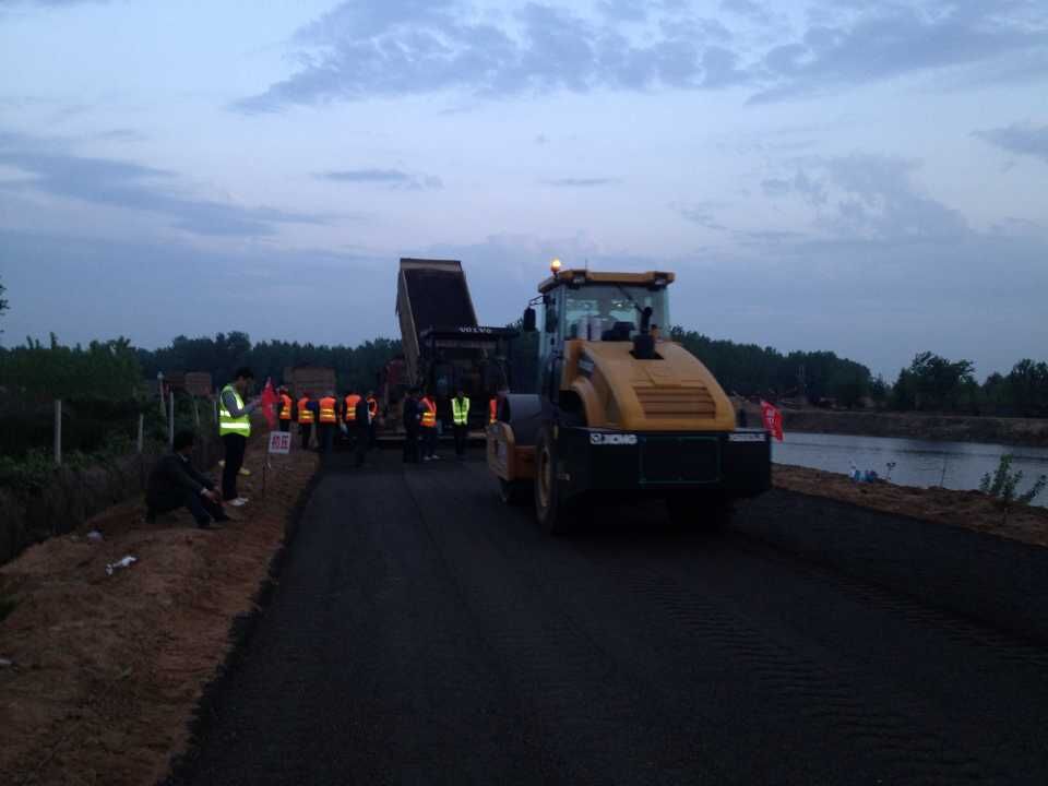 郯城縣白馬河左右堤(小馬頭橋~捷莊閘)路面建設(shè)工程,全長34km。自2016年4月12日開工以來,在郯城縣政府、郯城縣交通局、監(jiān)理單位以及公司領(lǐng)導(dǎo)的大力支持下,工程順利開展,各項(xiàng)工作有條不紊的進(jìn)行。截止2015年7月25日,工程任務(wù)中路基挖除、換填、水泥穩(wěn)定碎石基層、瀝青砼下面層工作已全部完成。另外,瀝青砼上面層和路緣石也已完成絕大部分。