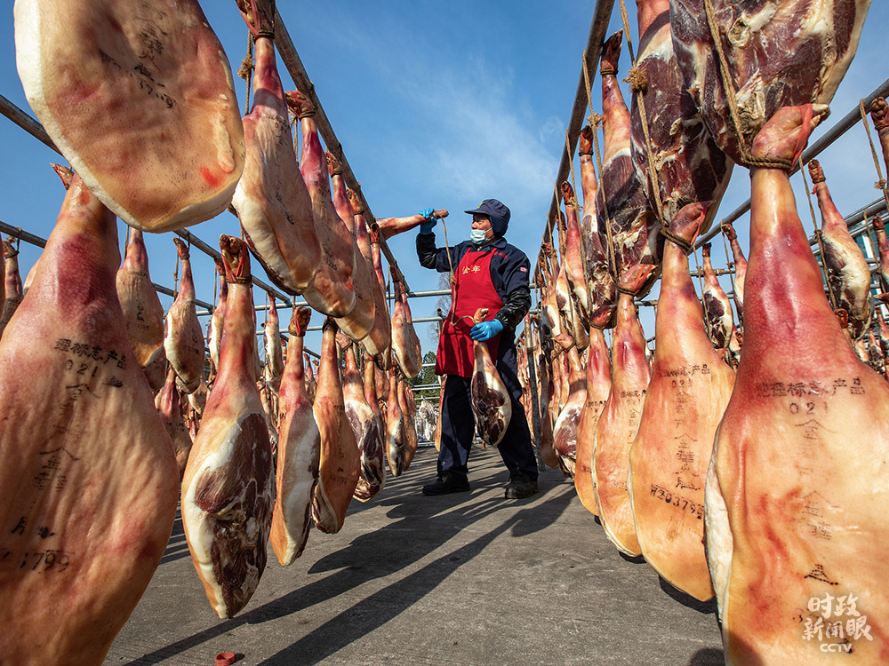 2021年1月10日,浙江金華某火腿加工區(qū)整整齊齊吊曬著上萬只火腿。