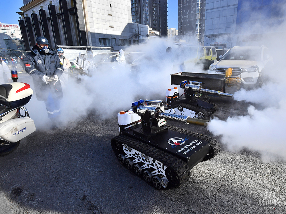 2021年1月9日,北京岳各莊市場,2臺“坦克”防疫消殺機(jī)器人對市場進(jìn)行消殺。這種消殺“新裝備”裝有大容量藥壺,每小時消殺約10000平方米。