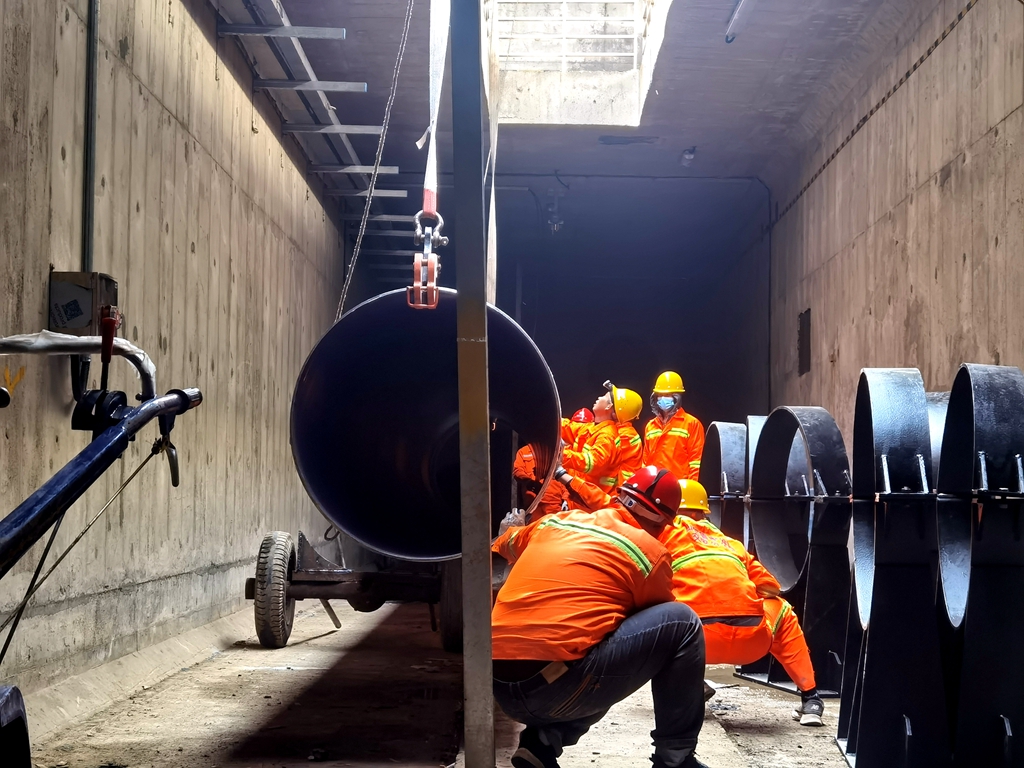 管道兩端用穩(wěn)繩控制吊轉入管廊