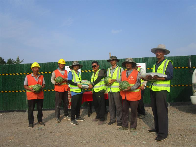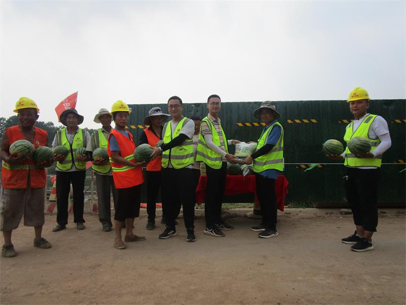 “講關(guān)懷、送清涼”小組人員從道路小樁號開始依次對路基、橋涵各分部送去藿香正氣水、郎秀礦泉水、綠豆、西瓜、工程項目施工人員安全指導手冊?;顒舆^程中,小組人員與現(xiàn)場人員對工作環(huán)境、工作時間等進行交流,橋涵一分部施工人員說道:“感謝項目部給一線工人送來的防暑降溫物品,送的是清涼,心里卻暖暖的”。