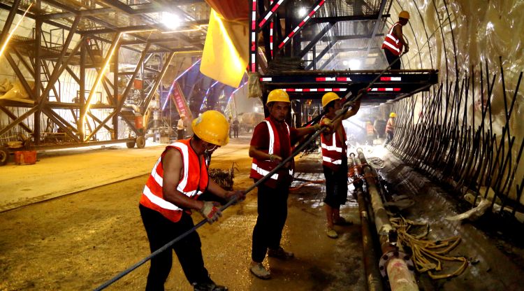 在盤頂山隧道內(nèi),工人們正在搬運(yùn)鋼筋。