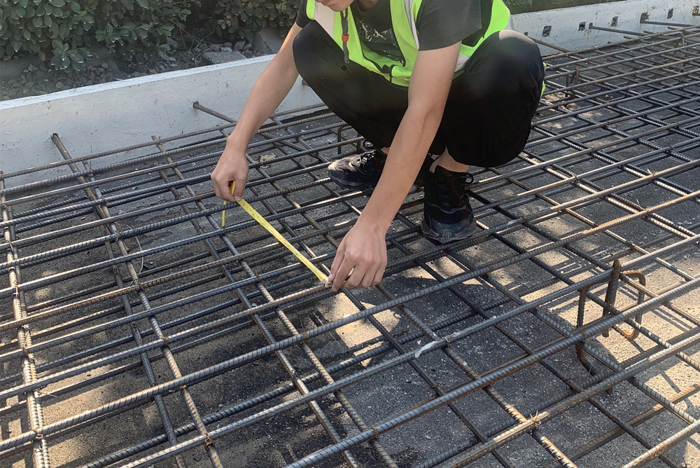 精準(zhǔn)施策,破解現(xiàn)場施工難。世上沒有兩片相同的樹葉。對于G205混凝土路段而言,則沒有兩根相同的鋼筋,沒有兩片相同的模板。由于地勢形勢,本路段全線曲折多變,這要求每一根鋼筋、每一塊模板、每一道刻紋必須精準(zhǔn)。從鋼筋綁扎開始,項(xiàng)目部人員便根據(jù)現(xiàn)場測得的實(shí)際坐標(biāo)一塊板一塊板布設(shè)點(diǎn)位,電腦制圖,測算每一根鋼筋、每一塊模板的實(shí)際長寬等指標(biāo)??碳y時,先行模擬出刻紋方案方能進(jìn)行實(shí)際操作。