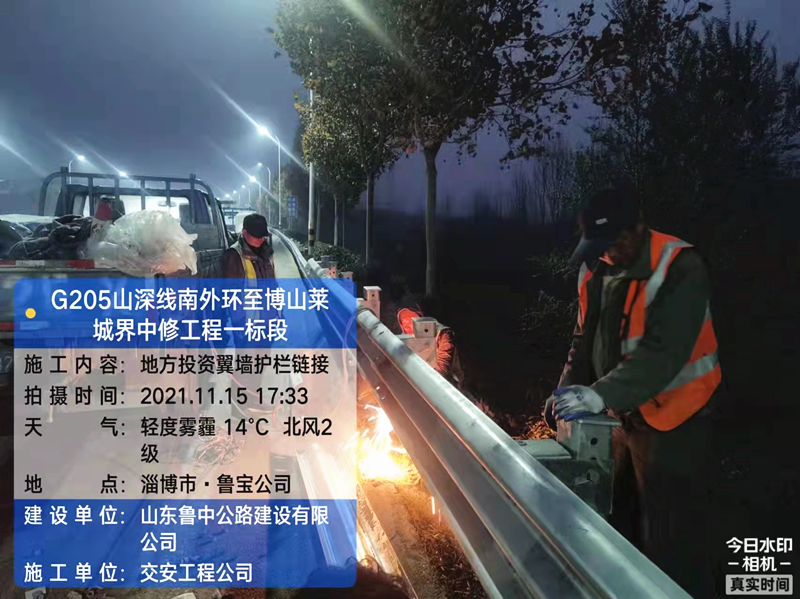 G205項目交安工程增加地方性投資工程量,拆除原有路測護(hù)欄及橋頭連接部后,加裝翼墻鏈接新鋼護(hù)欄,提高安全性。在拆除舊連接部不具備挖掘機(jī)作業(yè)條件的情況下,發(fā)揮人員能動性,用電鎬人工破除。11月5日接到施工通知后,為保障205交通安全,減少施工干擾,項目全員上陣,晝夜連動。僅8天時間,就突擊完成20個新增橋頭翼墻任務(wù),向業(yè)主、沿線居民及社會各界展現(xiàn)出“魯中公路速度”。