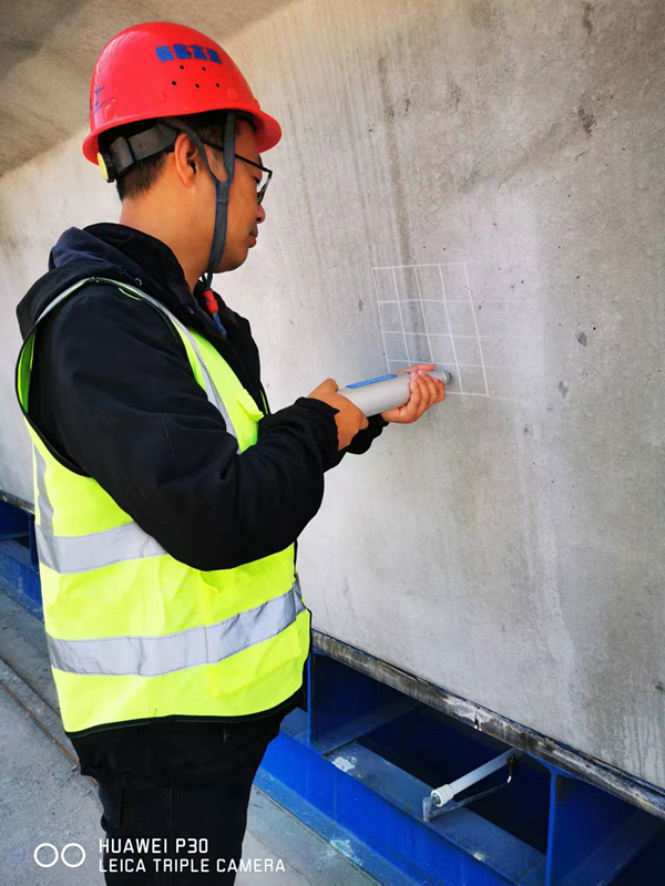 試驗室孫永賓在用回彈儀檢測預(yù)制箱梁強度
