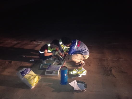 凌晨兩點(diǎn)二十分,借著車燈檢測路基壓實(shí)度的質(zhì)檢員袁建波、宋喜才、武向東。