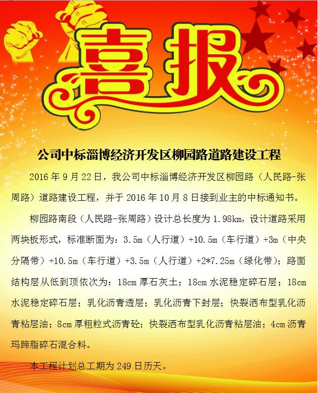 公司中標(biāo)淄博經(jīng)濟(jì)開發(fā)區(qū)柳園路道路建設(shè)工程