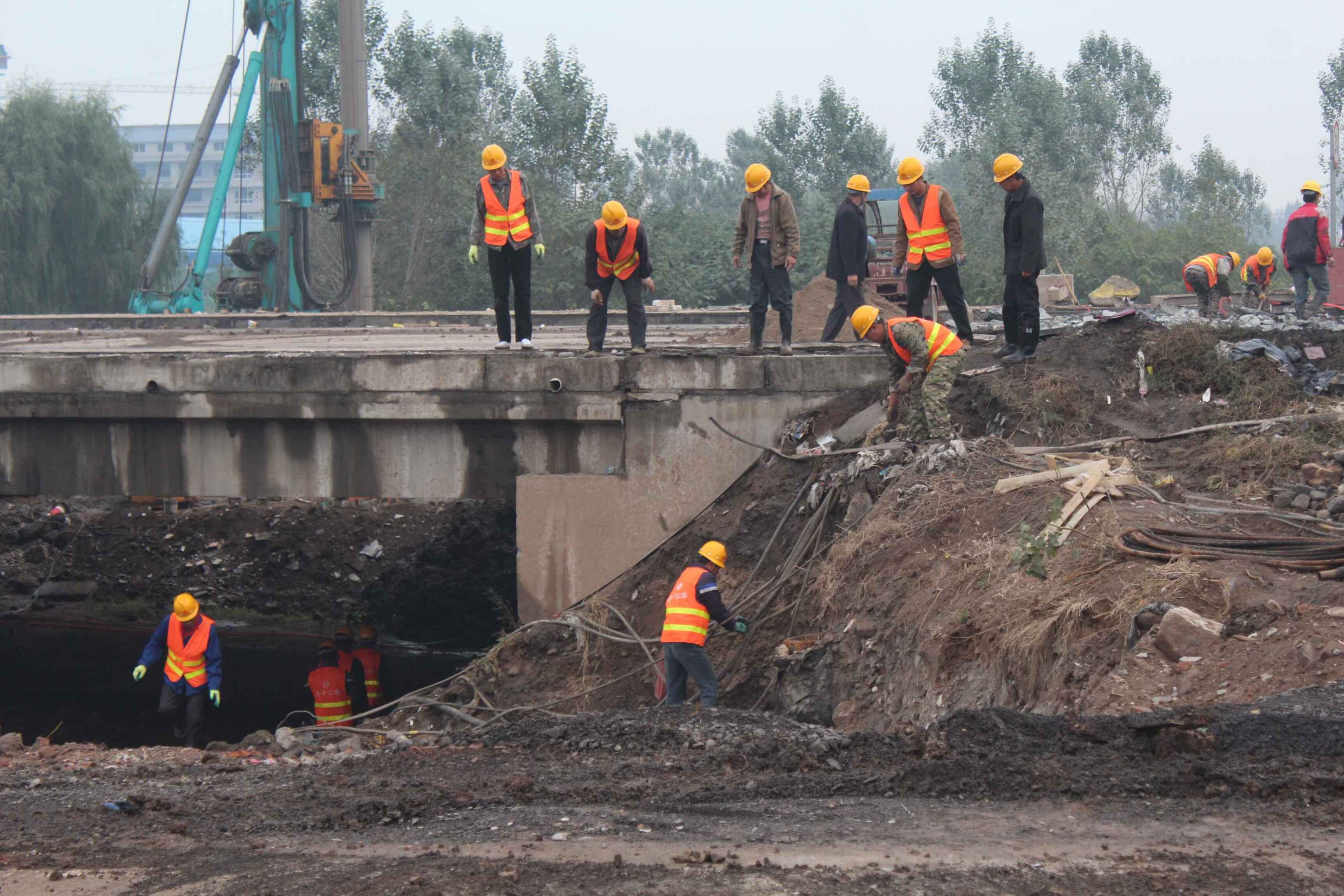 經(jīng)過(guò)前期的準(zhǔn)備工作,現(xiàn)拆除趙瓦危橋的工作進(jìn)入拆除橋體主體結(jié)構(gòu)的階段。上午7時(shí),省道S102濟(jì)青線(xiàn)路面中大橋工程二標(biāo)項(xiàng)目部在趙瓦村孝婦河橋頭召開(kāi)技術(shù)安全交底會(huì),對(duì)趙瓦孝婦河橋拆除工作進(jìn)行現(xiàn)場(chǎng)交底。15點(diǎn)58分,通過(guò)現(xiàn)場(chǎng)交底工作,發(fā)現(xiàn)準(zhǔn)備工作中尚存在不足之處,經(jīng)過(guò)分析和補(bǔ)充,在安全防范工作進(jìn)一步加強(qiáng)后,拆除工作在水炮抑塵的配合下展開(kāi)混凝土構(gòu)件破拆作業(yè)。